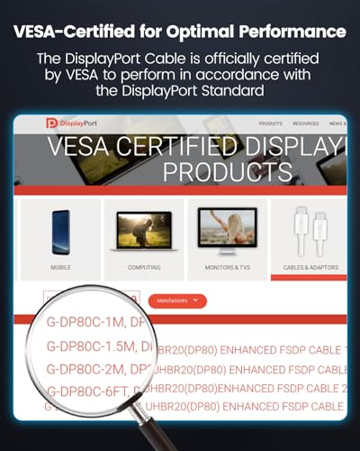 ?VESA Certified DP2.1 with 80Gbps?This VESA-certified DisplayPort 2.1 cable offers 80Gbps bandwidth, supporting the latest resolutions 16K@60Hz(DSC), 8K@240Hz(DSC), 4K@540Hz 480Hz(DSC), 8K@120Hz, and 4K@240Hz. Leveraging UHBR20 technology, it guarantees stable data transfer even under loads. Designed for professionals and enthusiasts, ensuring artifact-free visuals for 8K HDR content creation and high-refresh gaming.