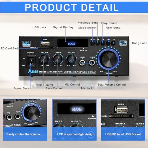 300W Peak / 40Wx2 RMS Power?AK-45 drives 4–16" passive speakers with 300W peak and 40Wx2 RMS output, delivering clear, high-fidelity sound for music, movies, or karaoke. Compact design fits neatly on desktops, bookshelves, or inside AV cabinets