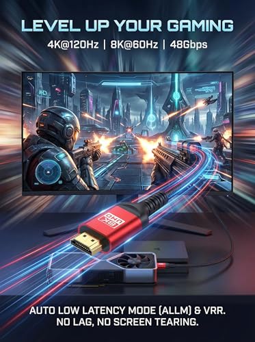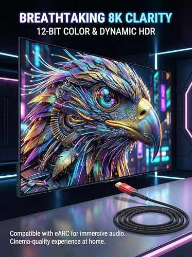 ? **Gaming Perfected**: Play without interruptions with our HDMI 2.1 cable featuring Variable Refresh Rate (VRR) to eliminate screen tearing and stuttering. Enhanced Audio Return Channel (eARC) ensures you hear every detail with rich, high-definition audio for an immersive gaming experience.
