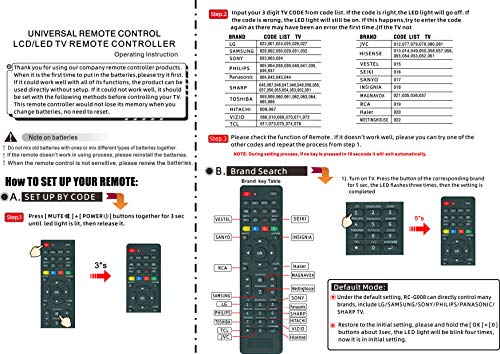 Universal remote Simple setting: Turn on the TV. Press the button of the corresponding brand for 5 seconds, the LED flashes three times, and the setting is complete. In the default settings, this product can directly control multiple brands, including LG / SAMSUNG / SONY / PHILIPS / PANASONIC / TV
