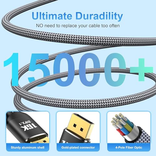 High Reliability Materials: Angusplay 16K DisplayPort 2.1 Cables are Made of pure SOLID copper conductors with triple-layer shielding to resist interference and ensure stable signal transmission. Durable and thickening housing, nylon braided jacket, 24K Gold-plated connectors to ensure the superior durability under the heavy usage and multiple plugging and unplugging