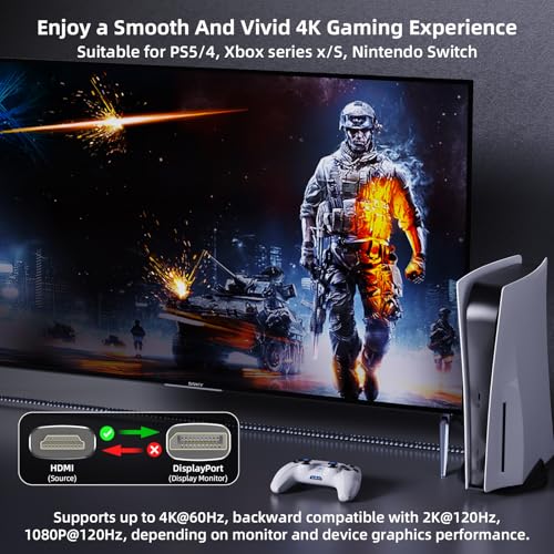 ?4K UHD Resolution?This HDMI to DP Cable is a work from home must-have that offers 4K resolutions up to 3840x2160 at 60Hz, backward compatible with 1440P@144Hz/120Hz, 1080P@165Hz/144Hz. Please note that game concales with native 4K @60Hz (such as XBOX One S) will display in 1080p.
