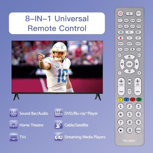 ?8-IN-1 Universal Remote Control?This versatile universal remote can operate 8 different device types - Sound Bar/Audio, Home Theatre, TVs, DVD/Blu-ray Player, Cable/Satellite, Streaming Media Players, and more. It is compatible with all TV brands, and covers all the functions of your old, original TV remote, providing a seamless replacement