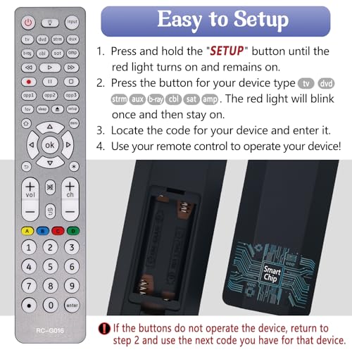 ?Easy to Use?This universal remote provides a seamless setup process: ?Press and hold the SETUP button until the red light turns on. ?Press and release the desired device button (tv/dvd/strm/aux/b-ray/cbl/sot/amp). ?Enter the first 4-digit code for your device. If the buttons do not function as expected, repeat steps 2-3 using the next code from the list until all buttons work properly. ?