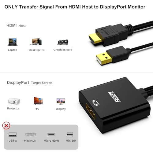 COMPACT DESIGN - The compact-designed portable BENFEI HDMI to DisplayPort adapter connects a computer, desktop, laptop, or other devices with HDMI port to a monitor, projector, HDTV, or other devices with DisplayPort port; Tuck this lightweight gadget into your bag or pocket to do a business presentation with your laptop and projector, or extend your desktop screen to a monitor or TV; A DisplayPort cable is required.