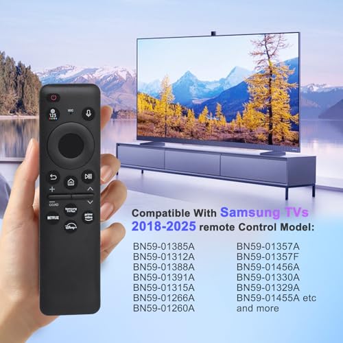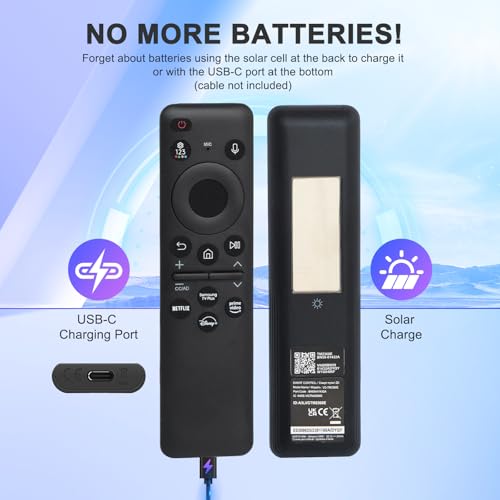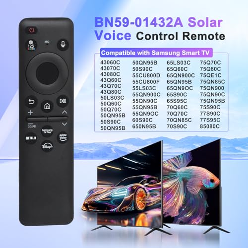 ?Compatibility?BN59-01432A Solar Voice Remote compatible with Samsung NEO QLED Frame Crystal UHD OLED 4K Smart TVs and supports Tizen operating system. Designed for Samsung Smart TVs from 2019 to 2025, this rechargeable voice remote is a seamless substitute. Shortcut Buttons: Netflix, Disney, Prime Video, and for Samsung TV dedicated shortcut buttons.
