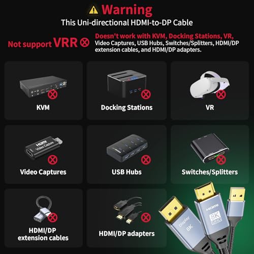 Important Note: 1)NO VRR. This HDMI input to Displayport output cable won't accept 2nd conversion. Not working with VR headset, docking station, video capture, switcher/splitter, KVM, and HDMI/Displayport adapter/extension cable. 2)The HDMI 2.1 to Displayport 1.4 out converter cable is a bypass cable. It cannot downscale or upscale, the resolutions and refresh rates
