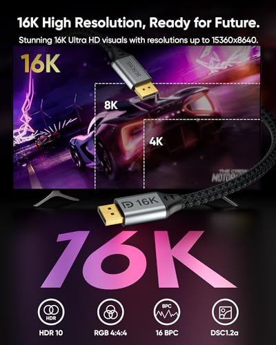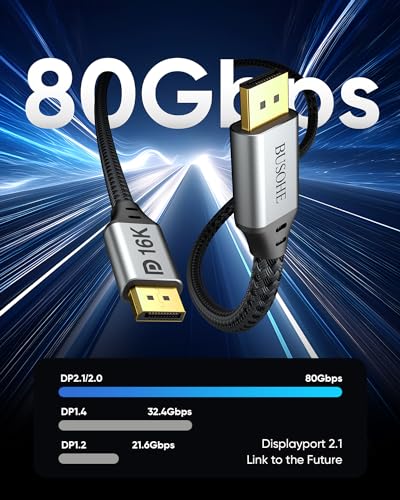 Really 16K DisplayPort 2.1 Cable : BUSOHE Display Port cable 2.1 support 80 Gbps bandwidth and high esolution 16K(15360x8640) 60Hz (with DSC), 8K 120Hz, 4K 240Hz/165Hz/144Hz, 2K 360Hz. The DP to DP 2.1 cable supports for Dynamic HDR, DSC1.2a, 3D, providing better content transmission and lossless audio output. Backwards compatible with DisplayPort 2.0/1.4/1.3/1.2/1.1