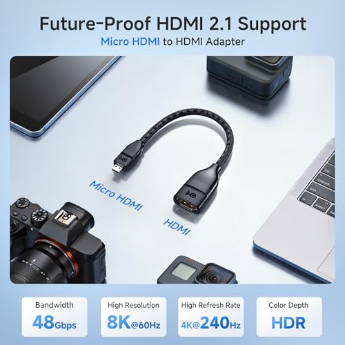 Micro HDMI 2.1 cable adapter supports 48Gbps data transfer for up to an 8K 60Hz display; Leverage the latest HDMI tech with this 8K micro HDMI adapter with an 8K resolution as specified in HDMI 2.1