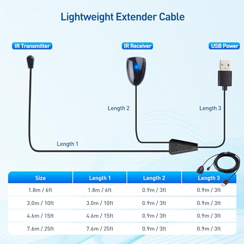 This IR extender supports a 15 ft IR signal range, ensuring reliable control for your devices even at a distance. For optimal performance, position the extender away from Wi-Fi routers or CFL bulbs, which may cause interference with the IR signal.