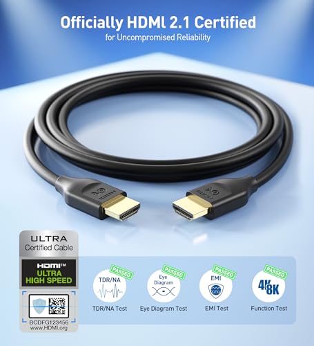 Universal Compatibility for Gaming & Streaming: The Certified Ultra High Speed HDMI cable 2.1 is compatible with PS5, PS4 Pro, Xbox Series X/S, and more. Enjoy lifelike visuals and responsive gameplay on your favorite devices, including Apple TV, Roku Ultra, NVIDIA RTX 3080/3090, and AMD RX 6800/6900 graphics systems.