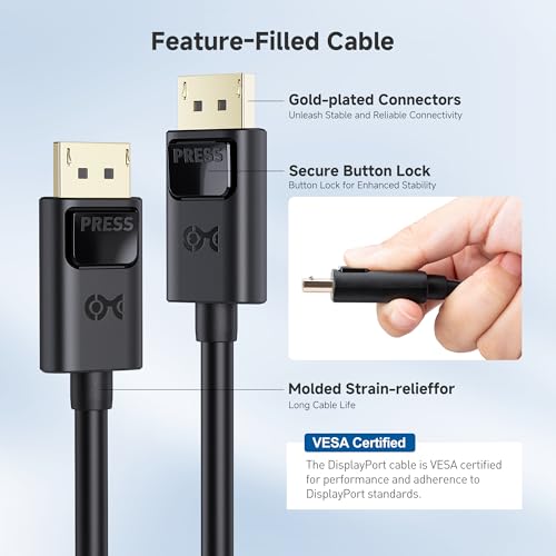 Durable Construction with Secure Latch: Built for long-term reliability, this DisplayPort 144Hz capable cable features gold-plated connectors, bare copper conductors, foil & braid shielding, and a secure locking latch to prevent accidental disconnection during use. Note: Depress the latch before unplugging the cable to avoid damage.
