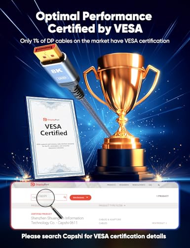 VESA Certified DP Cable 1.4: This 8K Displayport 1.4 Cable is officially certified by VESA Association; It supports 8K@60Hz, 5K@60Hz, 4K@144Hz, 2K@240Hz and HDCP 2.2/1.4. Display port 1.4 cable is more flexible and slimmer than 30AWG tinned copper, can directly be connected from DisplayPort equipped desktop/laptop to monitor