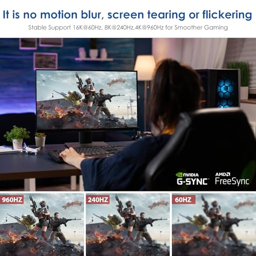 ?16K@60Hz & 4K@240Hz?This displayport 2.0 cable supports a high refresh rate of 240Hz. It is no motion blur, screen tearing or flickering. The Dbilida nylon braided displayport cable support 16K@60Hz, 10K@60Hz, 8K@120Hz / 60Hz, 5K@60Hz, 4K@240Hz / 165HZ / 144Hz / 120Hz / 60Hz, 2K@360Hz / 240Hz / 165Hz / 144Hz. 240Hz displayport cable, 165Hz displayport cable. *Note: Please make sure your device and the graphics card supports the refresh rate you want.