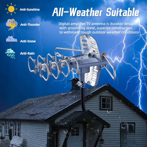 3.WEATHER PROOF STRONG PERFORMANCE: This outdoor TV antenna has updated outdoor performance. Antenna has prebuilt material with durable design, lightning protected, prevents from strong wind, heavy rain, and receives high definition and digital signals