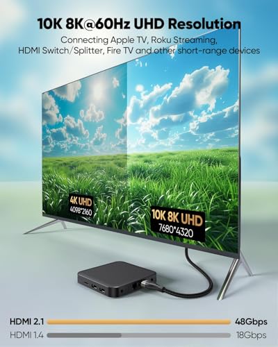 Universal Compatibility: 10K 8K HDMI cord is compatible with all HDMI devices, including HDMI Switch, KVM Switch, Apple TV, Roku Streaming Devices, PC, Laptop, Camera, Monitor, Projector, HDTV, Blu-ray Player, Fire TV, PS5/PS4, Xbox One, and more HDMI port devices. Also, backward compatible with HDMI 2.0b/2.0a/1.4/1.3/1.2/1.1 versions. Support Mirror & Extend mode