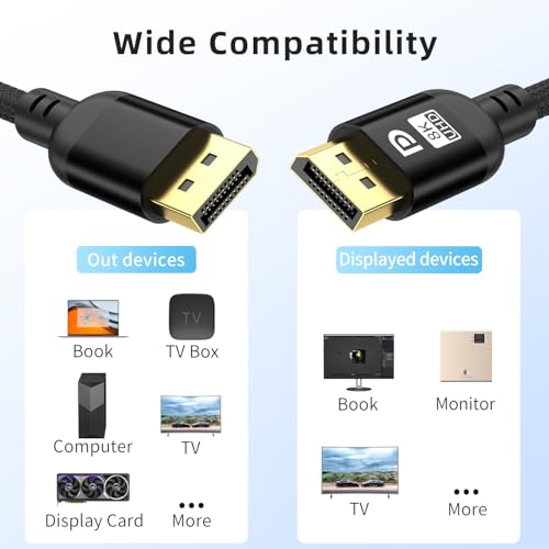 6.6ft Versatile Length for Flexible Setups:This 6.6ft DisplayPort cable strikes the perfect balance—long enough to connect devices with moderate spacing (e.g., gaming PC to a monitor 2ft away, laptop to a 4K TV across your desk) yet short enough to avoid messy tangles. Ideal for home offices, gaming stations, or living room setups.