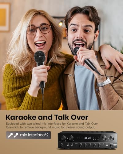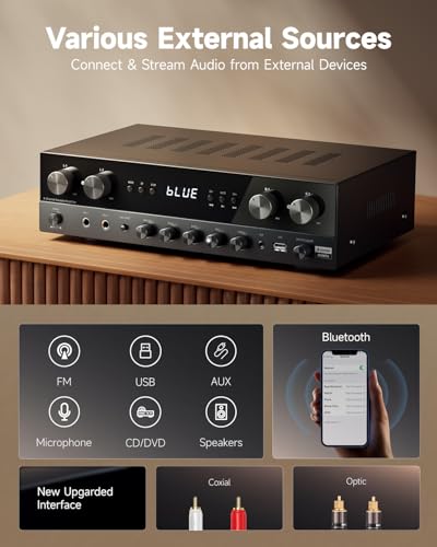 MULTI-INPUT MODES: The audio receiver supports various sound source inputs including Bluetooth 5.0, USB (up to 64G), 2 pairs of RCA, 2 mic inputs, AUX IN, and FM radio. In addition, digital Optical fiber and coaxial interfaces have been added to fit most smart TVs