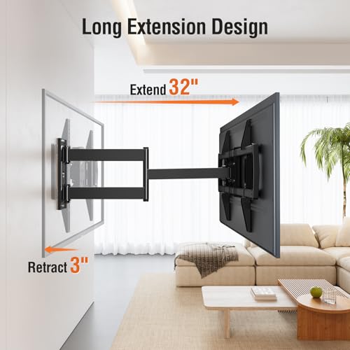 32" Extra Long Arm: Long extension TV mount can extend 32" away from wall, and retract 3" to wall to save space for a clean look. The long extend and swivel function allows to watch TV anywhere you're seated