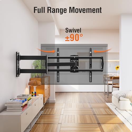 Ultimate Viewing Experience: The full motion TV wall mount can swivel left or right 90° to cover different viewing area, tilts +5°/-13° to reduce glare, and screen level+3°/-3° after installation