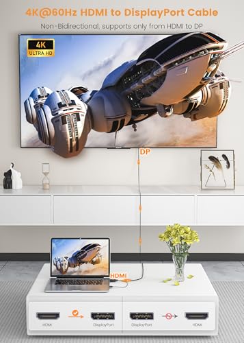 ?4K@60Hz HDMI to DisplayPort Cable? HDMI to DP transfer signal from HDMI output source devices to DP input monitor, supports resolution up to 4K (3840 x 2160)@60Hz, 4K@30Hz,1440P@60Hz, 1080P@60Hz. *Note: to get corresponding resolution rate, your PC/laptop and monitor must support the resolution both.