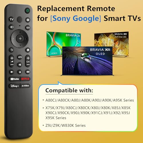 ?Compatible TV Models?This is an all-new upgraded remote control designed for Sony Bravia Google Smart TVs. It works with models including A80CJ/A80CK/A80J/A80K/A90J/A90K/A95K/ X75K/X79J/X80CJ/X80CK/X80J/X80K/X85J/X85K/X90CJ/X90CK/X90J/X90K/X91CJ/X91J/X92/X95J/X95K/Z9J/Z9K/W830K Series and more.