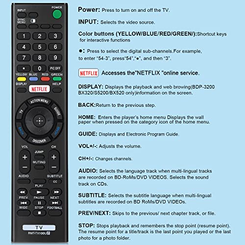 TV COMPATIBILITY : Universal RMT-TX100U remote control replacement for All Sony LED LCD OLED HD 4K UHD Bravia XBR KDL XR KD series smart TVs and for Sony TV remote RMT-TX100U.