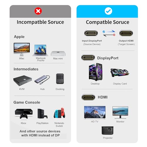 Compatibility: Compatible with desktop towers (e.g., HP, Dell Optiplex/Precision/xps, Lenovo), graphics cards (AMD, NVIDIA), and other DisplayPort devices. Not compatible with MacBook, PlayStation, Switch, and Xbox which are HDMI source devices.