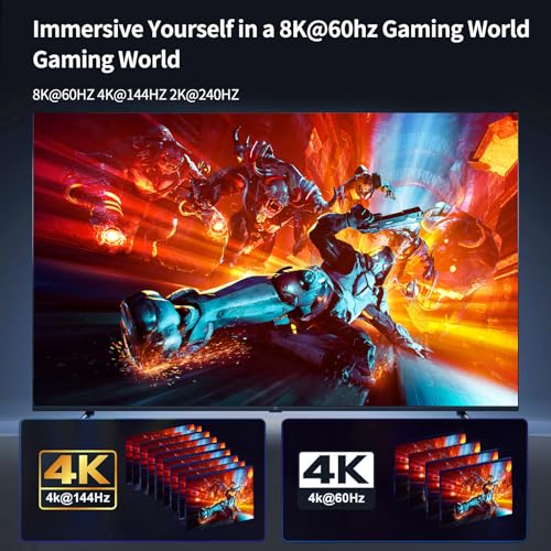 Image Conversion: It's a DP 1.4 to HDMI 2.1 cable, supporting up to 8K@60Hz video transmission and backward compatible with various high resolutions such as 4K@60Hz/120Hz/144Hz, 2K@120Hz/165Hz/240Hz. It offers a realistic 3D perspective and immersive experience, with good sound and image quality, signal stabilization, and no screen flicker. It supports Dynamic HDR, HDCP 2.3, DSC 1.2a, and Dolby 7.1, but not VRR/ALLM.
