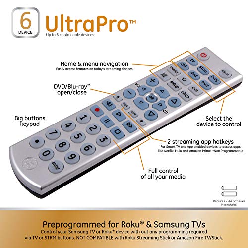 Preprogrammed for Samsung and Roku – Universal remote’s TV and STRM device buttons are preprogrammed for immediate use with Samsung TVs and Roku streaming media boxes (not compatible with Roku Streaming Sticks)