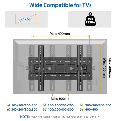Universal design TV mount - This tilt TV wall mount widely compatible 32 37 39 40 42 43 49 50 55 58 60 65 68 inch flat/curved screen television and monitor, Max load capacity 132lbs.Adjustable TV bracket has a compatible panel fits VESA 100x100mm (4"x4")?200x100mm (8"x4")?200x200mm (8"x8")?300x200mm (12"x8")?300x300mm(12"x12")?400x300mm (16"x12")?400x400mm (16"x16").Compatible to install TV, computers and other equipment,As long as the mounting screw hole VESA at the back of the TV or monitor is within 400x400mm, It is compatible with installation.Please check possible blocked cable/input before buying or installing.