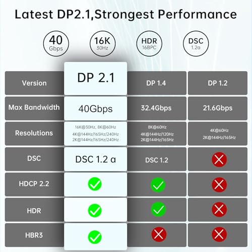 ?Optimal Choice for Gaming Enthusiasts?Display Port Cable 2.1 Experience vivid, lifelike colors, enhanced contrast, and realism with Dynamic HDR support, also supports UHBR10, DSC1.2a, 3D, HDR, FEC, and FreeSync necessary for gaming G-Sync. You can easily connect multiple monitors using Multi-Stream Transport (MST). Variable Refresh Rate (VRR) and Automatic Low Latency Mode (ALLM) bring you a smoother gaming experience, especially in FPS, AAA, and MOBA games.