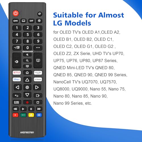 Perfect Compatibility: This universal lg remote is suitable for LG smart TV, for OLED TV's OLED A1,OLED A2, OLED B1, OLED B2, OLED C1, OLED C2, OLED G1, OLED G2 , OLED Z2, ZX Serie, UHD TV's UP70, UP75, UP76, UP80, UP87 Series, QNED Mini-LED TV's QNED 80, QNED 85, QNED 90, QNED 99 Series, NanoCell TV's UQ7070, UQ7570, UQ8000, UQ9000, Nano 55, Nano 75, Nano 80, Nano 85, Nano 90, Nano 99 Series, etc.