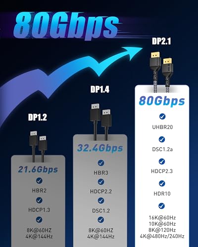 ?HIGH SPEED DISPLAYPORT 2.1 CABLE?HIGH END RESOLUTIONS 16K Displayport 2.1 feature provide 80Gbps bandwidth. Stable and High-speed transmission without signal loss. Meets the VESA Standard and supports Dynamic HDR 4:4:4 / HDR 10 and HDCP 2.2. Plug and play. Works with DP, DP++, and DisplayPort++
