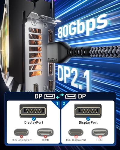 ?Reliable Anti-interference Capability?Our DisplayPort 2.1 Cable Made of 28AWG Tinned copper with triple-layer shielding to transfer stable video and audio signals.Quality nylon braided jacket with 30000+ bend lifespan provides you with a heavy duty DisplayPort to DisplayPort cable. 24K gold-plated connectors won’t tarnish or decrease conductivity over time