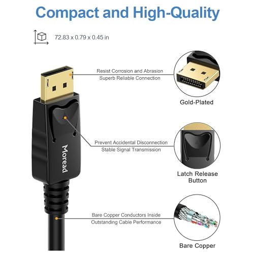 BROAD COMPATIBILITY: Moread DP to DP cable transmits high definition video and audio from your PC to a monitor for video streaming or gaming; Connect and configure your monitor for an Extended Desktop or Mirrored Displays