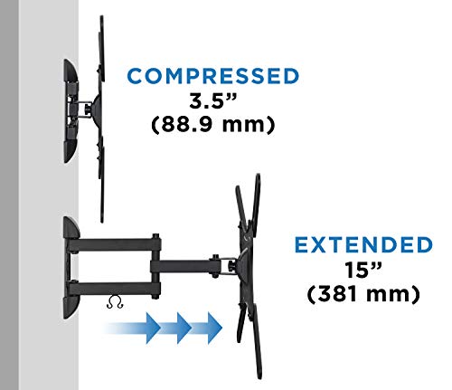 FULL MOTION TV WALL MOUNT: Articulating arms with adjustable 20 degrees tilt up and down; 180 degrees swivel left or right. Retracts to 3.5"; Extends up to 15.7" from the wall