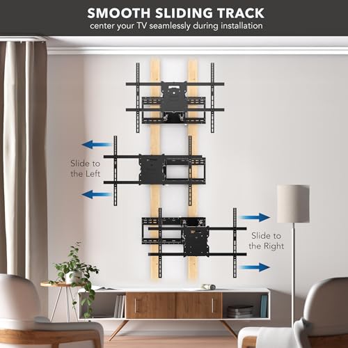[TILT] [SLIDE] [SWIVEL] & [EXTEND] to Discover the Perfect Viewing Angles: Our full rotation tv wall mount has a sliding wall plate to keep your TV centered in any position on the wall. Fully immerse yourself into any show, thanks to the 39 Inch long extension arm.
