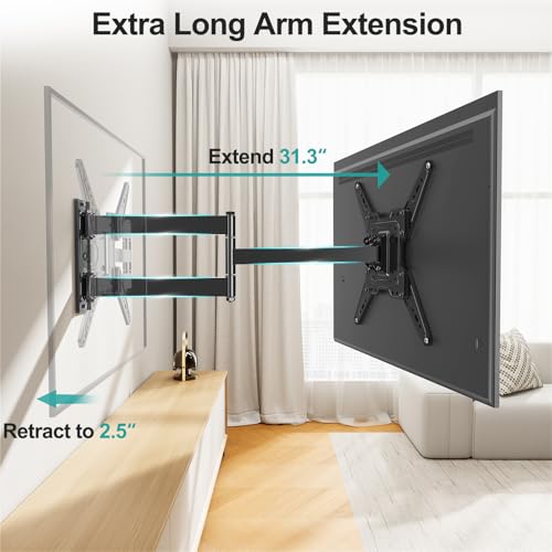 31.3" Long Extention TV Mount: The long arm TV wall bracket extends 31.3" from the wall for ultimate flexibility, retracts back to 2.5? for a clean, low-profile look. The long arm design and swivel function make the viewing more flexible and versatile