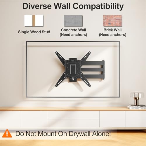 Hassle-Free Installation: Fits for most 32-65 inch TVs with VESA patterns from 75x75mm to 400x400mm and up to 99 lbs. Single stud tv mount is easier to install and comes with detailed instruction, drilling template, and labeled hardware. Concrete anchors will be sent per request. NOTE: DO NOT install into drywall alone