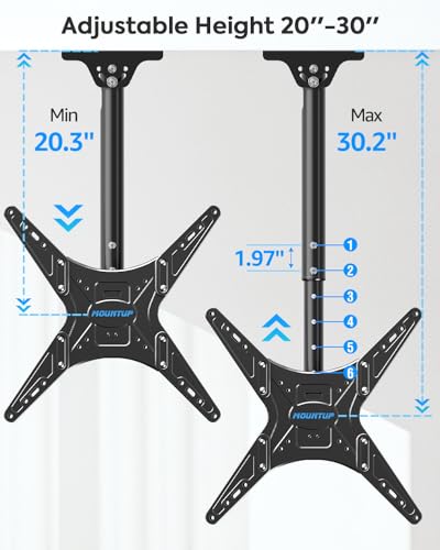 FULL MOTION FLEXIBILITY: +/-3° post-installation adjustment for perfect TV leveling, +5°/-15° tilt for anti-glaring, and 360° swivel to provide better viewing angles, up to 120° of swivel at the base fits for flat or slanted ceilings and 20.33” to 30.18” pole height adjustment for flexible movement and space-saving.