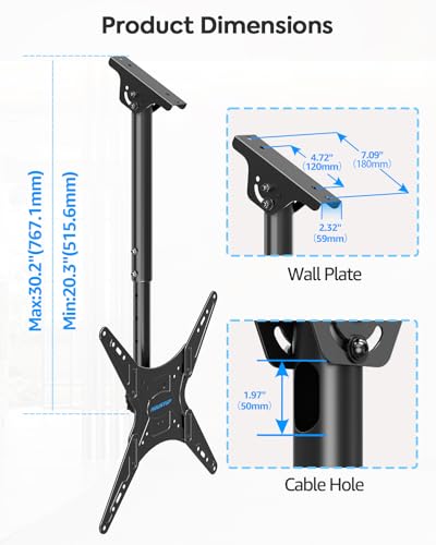 FRIENDLY CUSTOMER SERVICE: Please feel comfortable to contact our friendly support team to ask pre-purchase or installation questions. MOUNTUP TV ceiling mount comes with a full 3-year protection. Please check the VESA, TV weight, wall type, and possible blocked input before purchase.