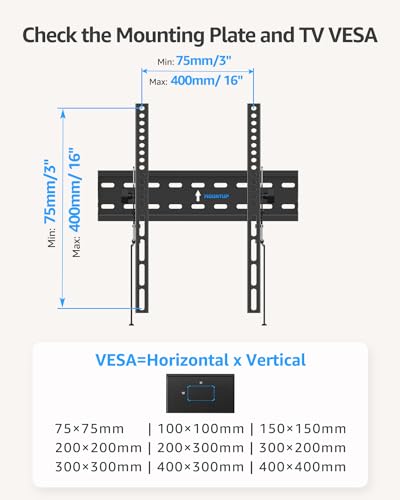 TV COMPATIBILITY: The tilting TV wall mount with universal design fits most 26 32 36 42 43 50 55 60 inch flat or curved TVs up to 99 lbs. Compatible with VESA 75x75 mm to 400x400 mm mounting patterns. Design for wood studs spacing up to 16 inches. NOTE: Not for drywall alone application.