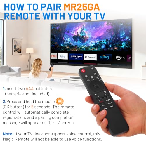 Quick Pairing: Just install two AA batteries in the mr25ga for lg tv magic remote, then press and hold the 'Home' and 'Back' buttons for 5 seconds. Aim at your TV and press the Wheel (OK) button to pair. Note: lf your TV does not support voice control, thisMagic Remote will not be able to use voice functions.