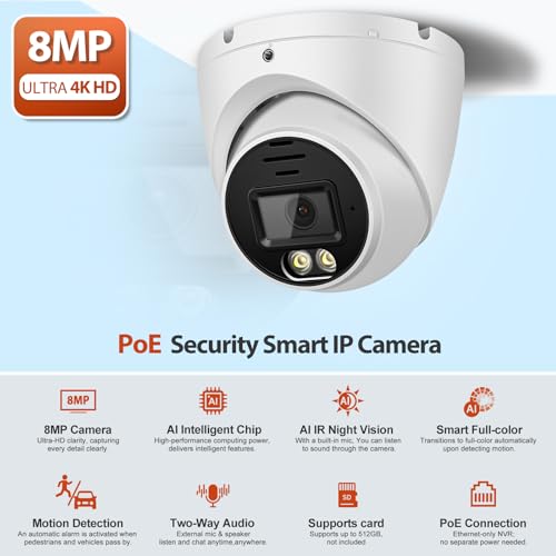 ?Smart Color Night Vision+ 2 Way Talk?This PoE IP camera has 3 light modes. Smart light mode, IR light mode,and white light modede.You can switch from mobile APP.Camera default Smart Color Night Vision mode:Infrared (IR) works normally at night, and the white light activates only when movement is detected, providing clear,full-color images during alerts.It has a built in microphone and speaker,you can listen and speak in real time.