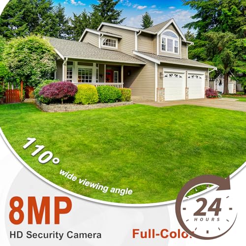 ?8MP UltraHD + 2.8MM 110°Wide Angle Lens?This security camera has a 8MP(3840*2160p) HD resolution,delivering exceptionally clear and detailed images.It features a 1/2.8" CMOS sensor, which captures more light compared to traditional 1/3" sensors,ensuring superior performance in low-light conditions and producing brighter,sharper footage.Equipped with a 2.8mm fixed lens,it provides a 110°super wide viewing angle,offering extensive coverage for enhanced monitoring of large area.