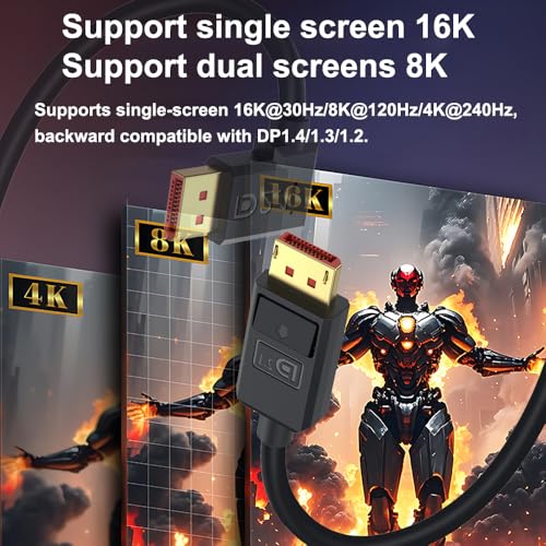 2.1 DisplayPort cables support 16K@30Hz/8K@120Hz/4K@240Hz, 15360*8640 DPI. Supports single-screen and dual-screen. Single-screen video output 16K@30Hz (DSC 1.2a). A length of 6ft/1.8 meters enables long-distance connection.