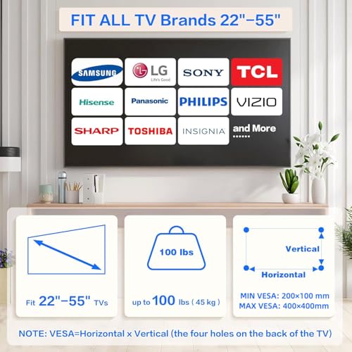 ?NO DRILL TV MOUNT COMPATIBILITY?KAMIWI No stud TV wall mount compatible with SAMSUNG, SONY, LG, VIZIO, TCL, HISENSE, PHILIPS, PANASONIC, INSIGNIA etc. Most brands flat screen TVs between 22-55 Inches and weight up to 100 lbs. Works with standard VESA patterns from VESA 200×100mm to VESA 400×400mm
