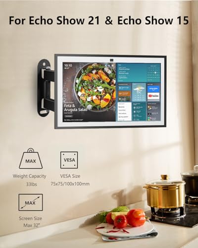 Adjustable Wall Mounting Bracket for Echo Show 15 - Hang your show 15 monitor screen on wall, you can simply screw it to the wall to free up the desk. Such a mounting bracket for echo show 15, echo show 21 also fits well with 10”-32” lcd led screen, pc devices or other smart displays, and our monitor wall mount has a classic black color fits for various decoration style. Please check your single stud location and TV VESA mount (Max: 100x100mm, Min: 75x75mm) before purchase