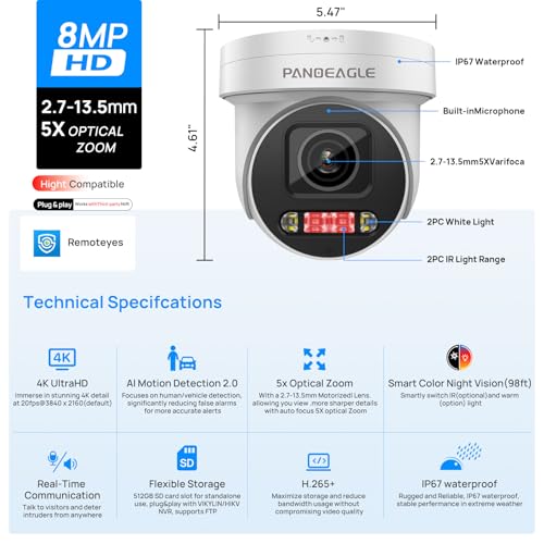 ?Smart Dual Light Full Color Camera?: This 8mp full color poe ip camera equiped with 1/2.8” IMX415 CMOS 8MP(3840×2160)@20fps CMOS provides ultra stunning image quality the whole day. Equips with smart dual illumination(Built-in 4 warm lights and 4 IR LEDs), provides incomparable colorful video up to 98ft even in the environment of 0 illuminance and guarantee the crystal image effect.With 2.7~13.5mm Motorized Varifocal Lens allows 5x optical zoom to capture more details.